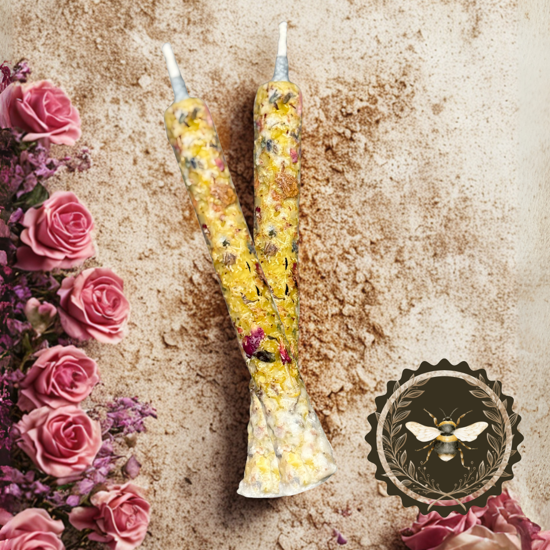 Včelí vosk je ručně obohacen o květy růže, levandule a rozmarýnu, které při zapálení uvolňují jemnou, očistnou vůni a podporují energetickou práci: